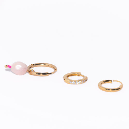 SET DE 3 HUGGIES DORADOS CON DIJE DE CUARZO Y CUENTA ROSA.