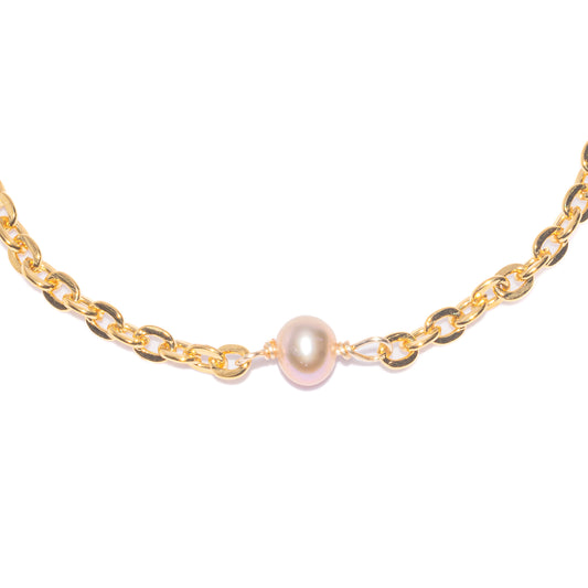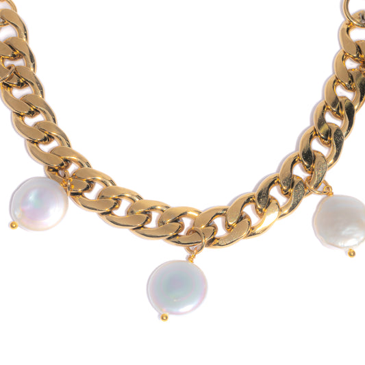PULSERA DE ESLABONES DORADOS CON DIJES DE PERLAS REDONDAS COLGANTES